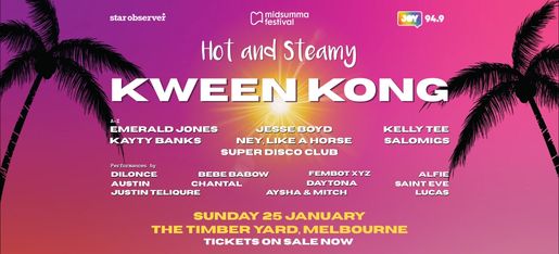 Headlined by Global Drag Race superstar KWEEN KONG, alongside national and international DJs: Kayty Banks (WA), Ney, Like a Horses (QLD), Emerald Jones, Jesse Boyd & Super Disco Club (VIC), Salomigs (BRAZIL) & Kelly Tee (UK). Hot and Steamy also features a diverse cast of performers, all celebrating varied identities and backgrounds.